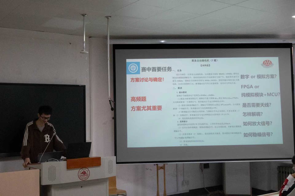 随后,马研新同学就高频题的实战应用展开了深入剖析。他重点介绍了DDS模块、ADC采集、滤波器设计与运算放大器等关键模块,并分享了如何通过阅读芯片手册、遴选成型模块来提升备赛效率。马研新强调,“方案优先”是应对高频题的重要经验。尤其对于模数方案、天线选型与信号稳幅等关键环节,务必备好预案,以减少临场决策。对此,张慕恒也深表赞同,他鼓励大家“以赛促学”,建议通过课设项目、校级模拟赛等方式积累实战经验。同时,他也特别强调了团队协作与统筹领导能力在比赛中的关键作用。