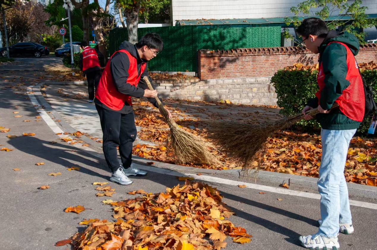 活动过程中,志愿者们热情高涨。尽管秋风微凉,但大家干劲十足——有的用扫帚将落叶聚拢成堆,有的将散叶扫入垃圾袋,还有的协助搬运装满落叶的袋子。经过共同努力,原本铺满落叶的道路与草坪很快恢复整洁,校园公共区域焕然一新。