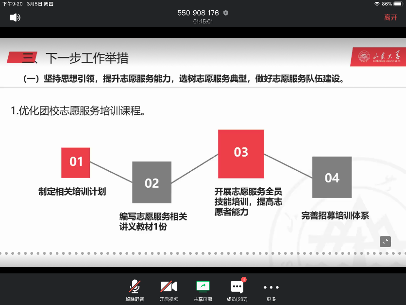 最后,山东大学团委书记张熙老师总结了本次“学雷锋,战疫情,讲奉献,爱劳动”志愿服务主题团课。他指出山东大学一直秉持“奉献、友爱、互助、进步”的志愿服务精神,坚持立德树人根本任务,倡导形成“人人都做志愿者”的优良风气。对目前我校开展志愿服务活动的情况,张熙表示十分满意并激励我校青年学子继续传承新时代雷锋精神,用行动绘就高尚品格、以奋进丈量青春脉搏。