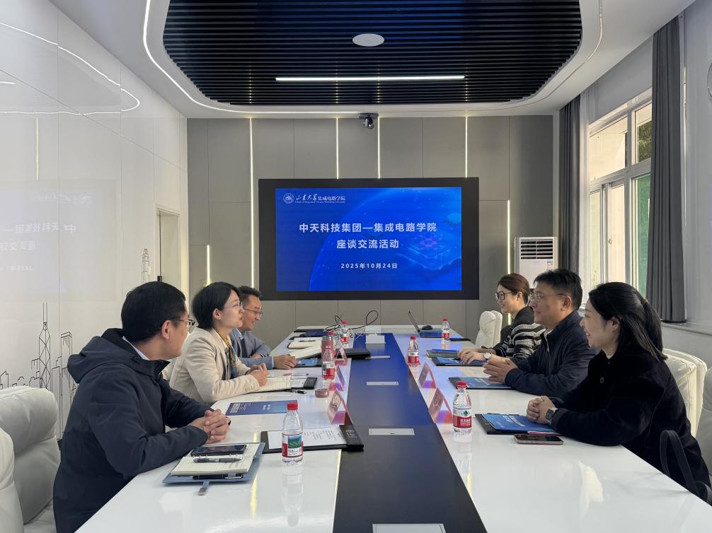 10月24日上午,中天科技通信产业集团副总裁、山东大学南通校友会会长符小东,中天通信技术有限公司人事总监陈培培,苏州研究院副院长郝立群来访集成电路学院,学院党委副书记路丽丽及教师代表参加会议。路丽丽代表学院对符小东一行表示热烈欢迎。首先,符小东一行参观了集成电路学院展厅,加深了对学院的发展历史、人才培养、科研成果、东山集群以及RISC-V开源生态建设情况的了解。随后,在座谈环节中,符小东介绍了中天科技集...
