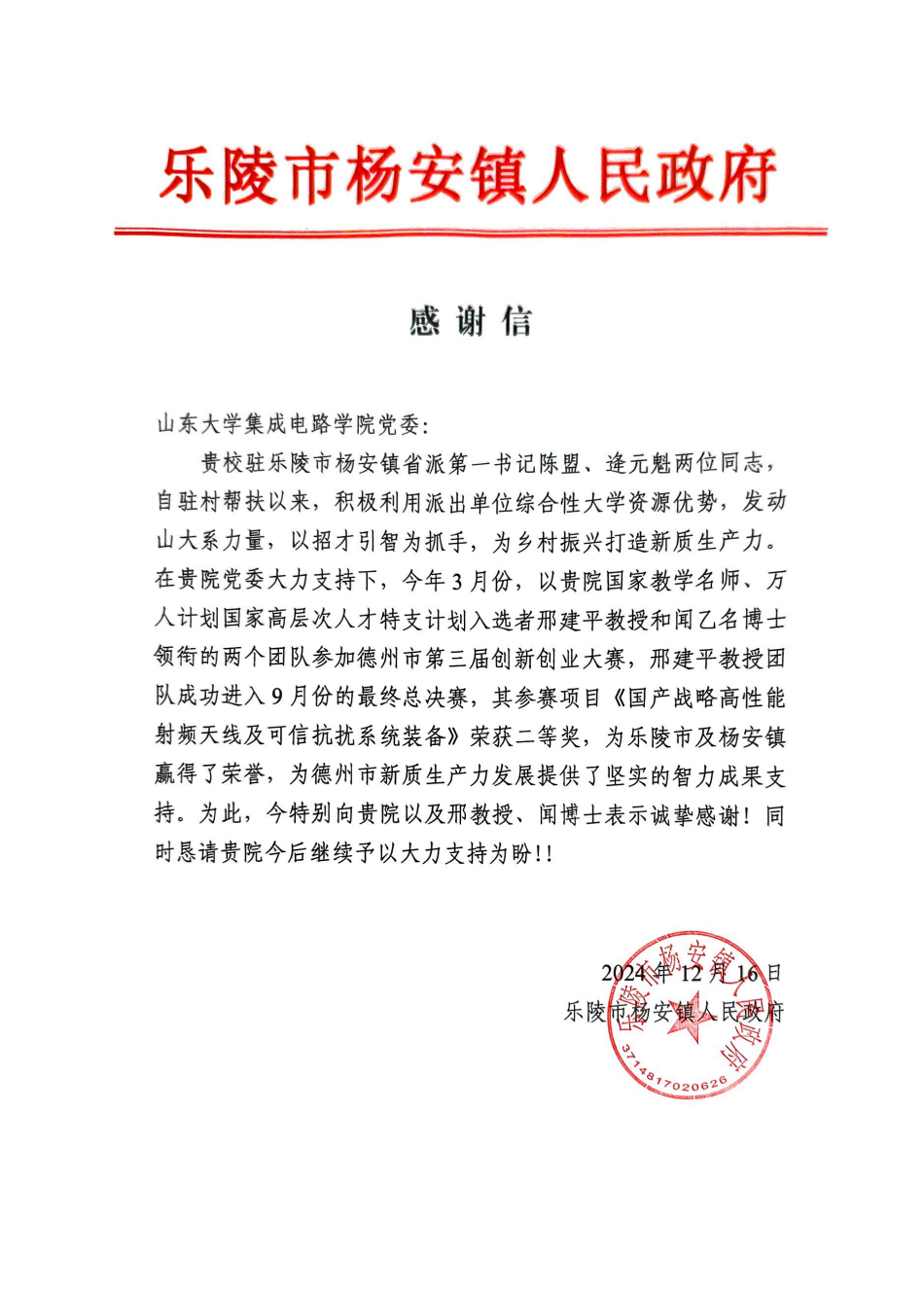 乐陵市杨安镇人民政府给山东大学集成电路学院党委的感谢信