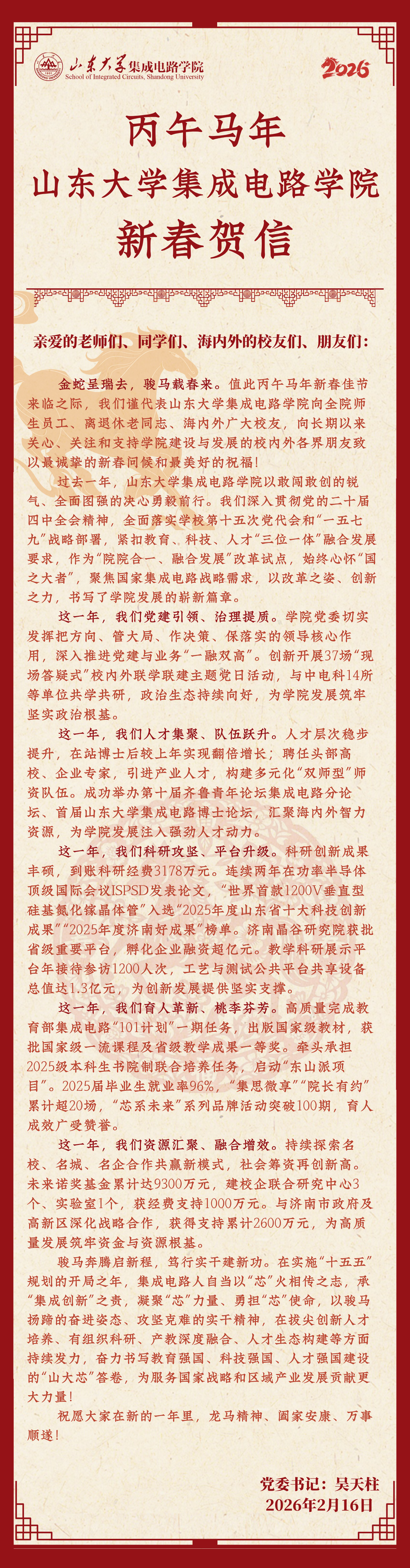 丙午马年山东大学集成电路学院新春贺信