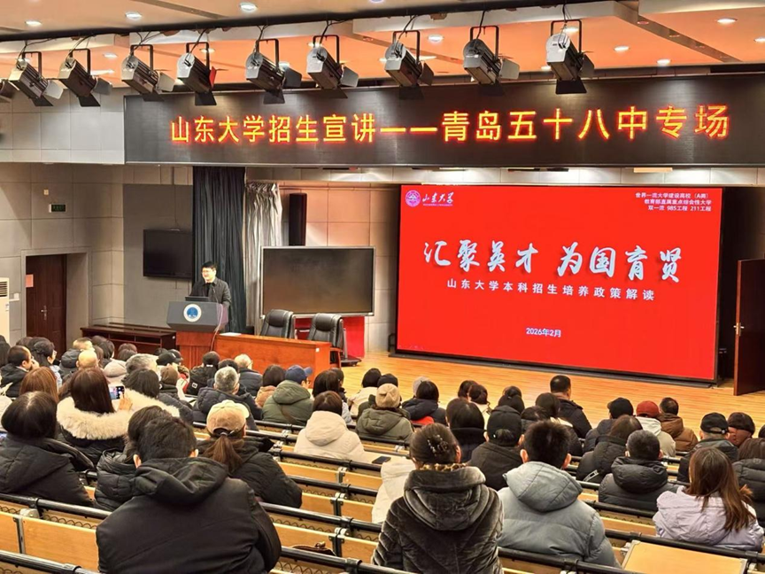 在青岛五十八中,李虎为该校高三师生及部分家长带来了一场题为“汇聚英才 为国育贤”的精彩报告。报告会上,李虎详细介绍了山东大学的办学历史、学科优势、人才培养以及拔尖创新人才培养计划,并对2026年的本科招生政策进行了全面、深入的解读。他鼓励优秀学子积极报考山东大学,在这片学术沃土上成就梦想,现场互动热烈,反响良好。