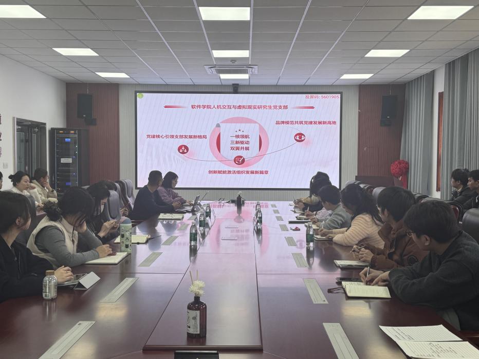 山东大学研究生样板党支部、软件学院人机交互与虚拟现实研究生党支部书记汪冰倩对党支部建设思路进行了总结与介绍,分享了支部“一核领航·三新驱动·双翼并展”的建设模式,一是党建核心引领支部发展新格局,让理论学习沉浸式,让组织管理体系化,榜样宣传立体化;二是创新赋能,通过组织革新,技术创新与平台拓展,激活党支部组织发展内生动力;三是品牌建设提升党建工作高度,以“党员先锋”和“品牌活动”为双翼,打造党建品牌模范,以丰富的形式强化党员党性修养。