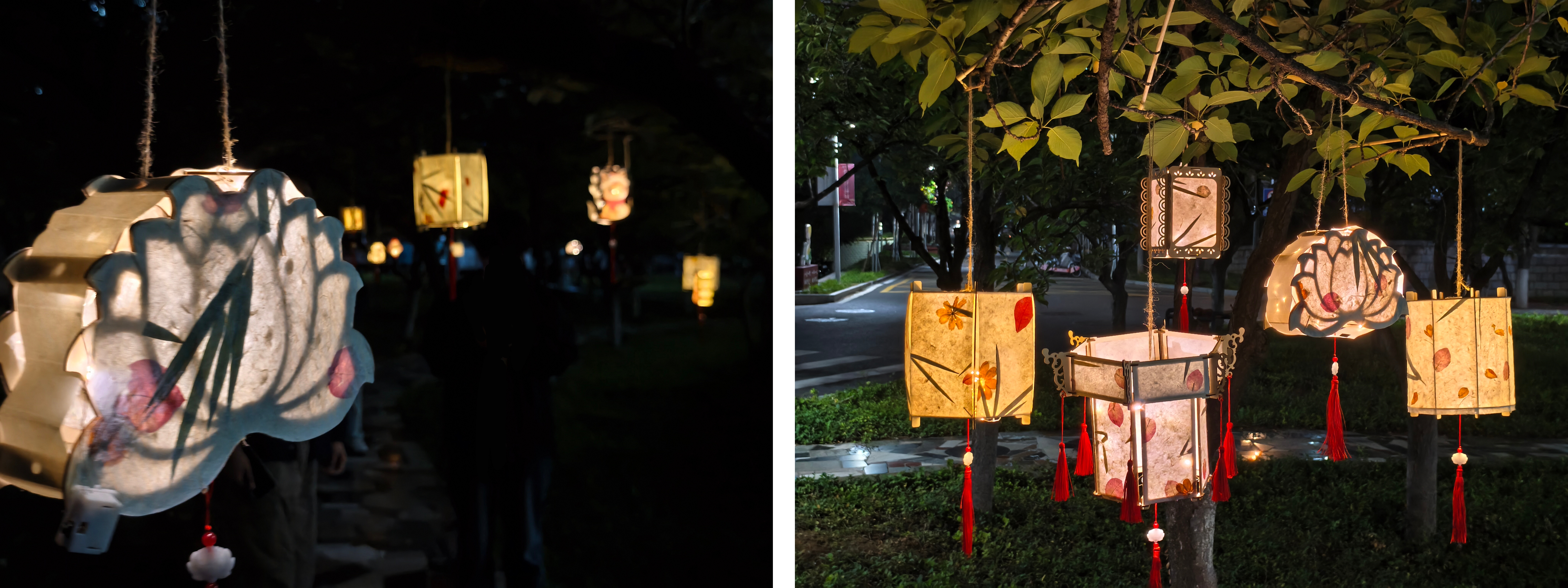 随着夜幕降临,一盏盏凝聚着智慧与巧思的灯笼 作品 渐次点亮。柔和的光芒在场地内流淌,映照着同学们喜悦的笑脸。形态各异、独具匠心的灯笼既是对传统文化的致敬,也是个人艺术情感的表达。灯笼高挂于枝头,共同构成了一片星光灿烂的节日景象。