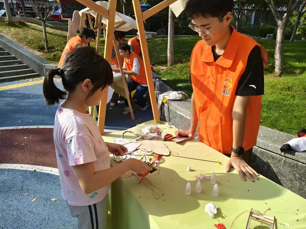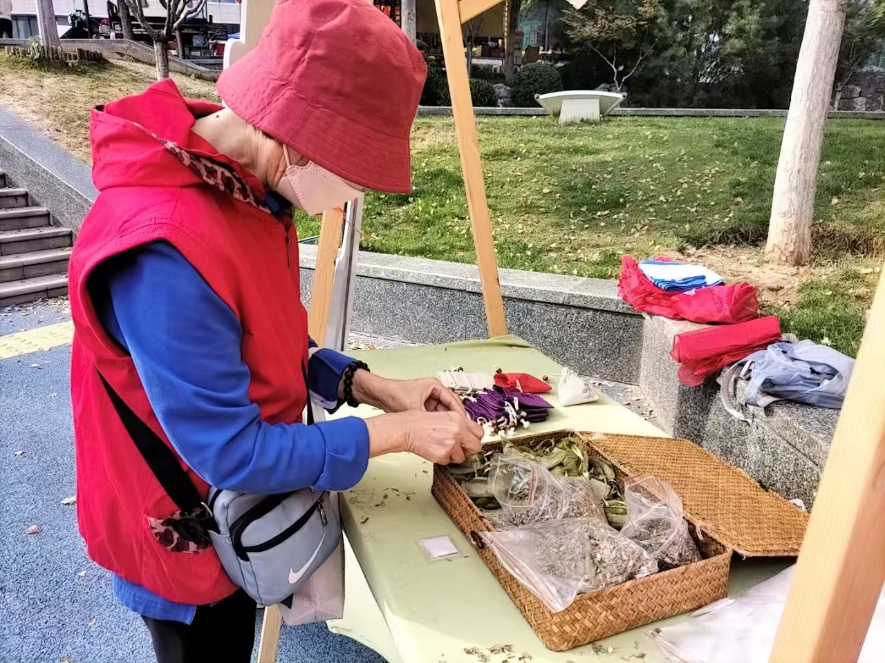 在手工体验区也同样热闹。在灯笼DIY区,郭智涵等志愿者耐心指导参与者,让其制作自己的专属灯笼;在中秋香囊制作区,牟紫绮等志愿者提供各式各样的药材,让居民根据自身喜好制作自己的香囊,让居民们在手工制作中感受手工创作与传统文化融合的魅力。