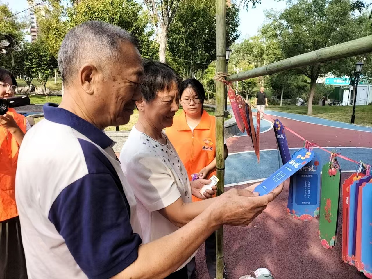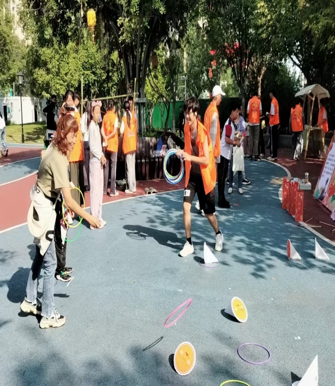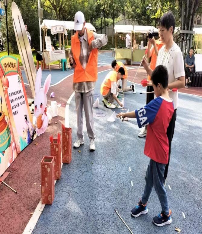 在猜灯谜区,李家琪等志愿者准备老少咸宜的灯谜,“一边绿,一边红,一边怕水,一边怕虫(打一字)”,大家驻足思考,互相讨论,猜对的人欣喜集章;在玉兔套圈、投壶月宫投壶等游戏区也人山人海,居民在房文正等志愿者协助下,体验中秋传统游戏的快乐。套中的激动,投壶的期待,让现场欢笑不断。