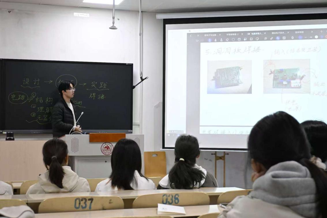 第三场分享聚焦“电赛硬件与焊接实战”,王明军与袁嘉辉从实际操作的常见问题入手,细致讲解了焊接工具的选择、电路调试方法,并重点演示了如何避免虚焊、规范布线等关键技巧。活动还安排了动手练习环节,让同学们能当场操作,巩固所学。
