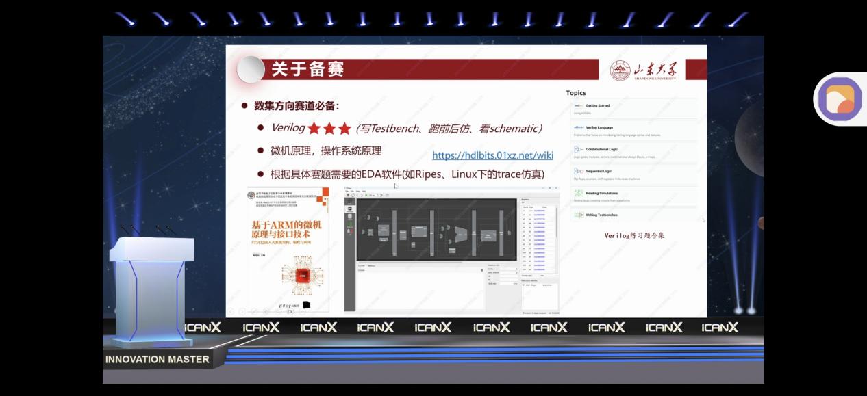 首位分享的嘉宾刘怀谦首先强调了集创赛的重要性:集创赛既是检验专业能力的“试金石”,也是进入头部企业的“敲门砖”。针对同学们最关心的赛道选择问题,他特别区分了A组(纯 本科生)与B组(含研究生)的差异:A组竞争压力相对较小,更适合追求奖项的本科生;B组则更侧重学术深度,适合有科研基础的团队。他提出:“如果你的目标是拿奖,优先选A组;如果想挑战自己,可以尝试B组,但要做好应对更强对手的准备。”随后,他梳理了集创赛的关键时间节点,并给出了具体行动指南。1月到5月,同学们需尽快组队并选择合适赛道,集中完成作品原型和初赛报告。6月至7月晋级后,应着力提升作品的完整与稳定性,进行多次演练。在8月的全国总决赛阶段,备赛重点应转向突出创新性、产业适配性,并提前熟悉限时实操任务。针对近年来最热门的“基于RISC-V指令集的CPU设计”赛题,刘怀谦指出,该赛道的硬件需基于FPGA实现,核心在于完成五级流水线与分支预测。测评以速度为关键,必须重视指令编译与功能验证。他结合自身调试经历提醒学生,功能验证是基础,若无法保证指令正确执行,再高的运行速度也没有意义。