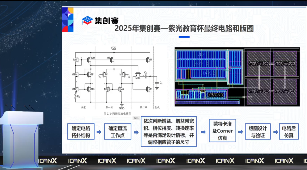 周冉冉对2025年集创赛典型赛题进行了解析,分享了针对性的解题思路。她结合国奖选手的经验,给出了分阶段规划,即“寒假打基础、三月启动、四月收尾”,介绍了赛前积累、赛题发布后高效推进的通用方法。此外,她还提出了一系列具体行动建议,如提前选题定导师、明确团队分工、严格执行计划、尽早实践、及时沟通、留存仿真结果等,并提供了模拟方向与电子资源参考。