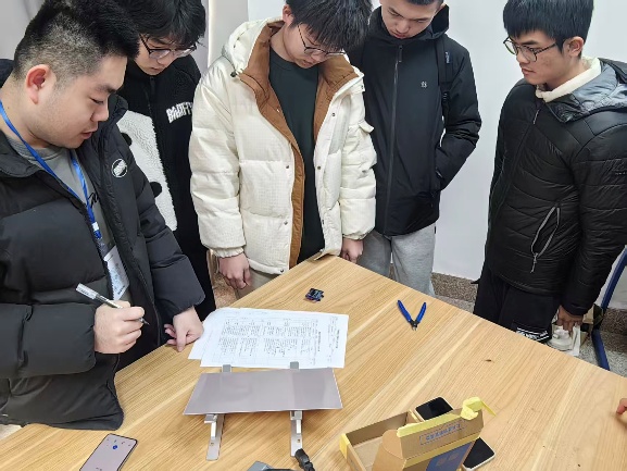比赛现场紧张有序,参赛选手全情投入实践调试与现场测评核心环节。本次比赛设定“简易智能手表”指定赛题,要求基于STM32单片机设计制作,需实现时钟、水平仪、斜坡倾角测量等基础功能,同时完成音乐播放、陀螺仪小游戏等拓展任务,综合考验选手的嵌入式硬件设计与系统调试能力。现场测评围绕作品功能实现、精度控制、人机交互等核心维度开展,选手现场演示作品各项功能,完成实操考核。