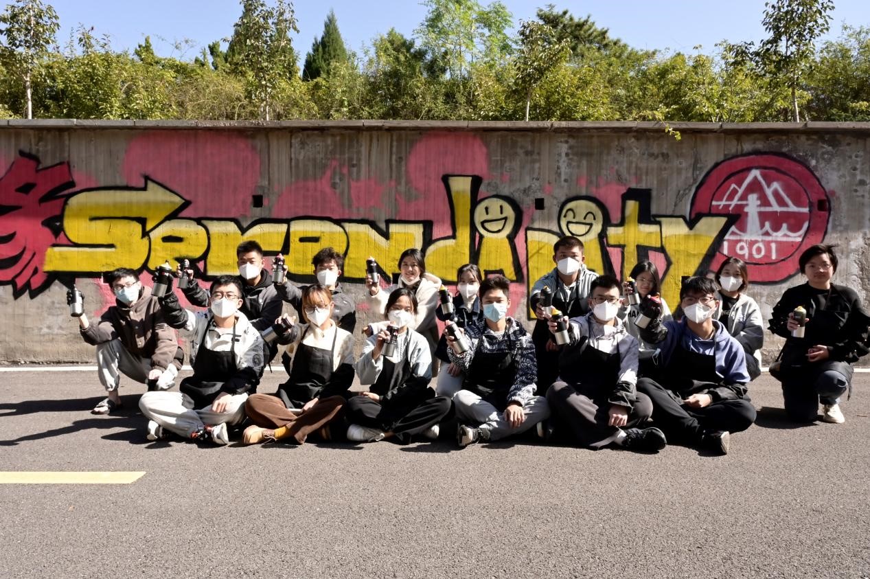 上午9时,涂鸦活动正式启动,本次涂鸦由图案设计者王厅、 刘飞扬、杨佳钰及2022级部分新生一同绘制。在喷绘期间不断有学生路过,纷纷驻足观看。