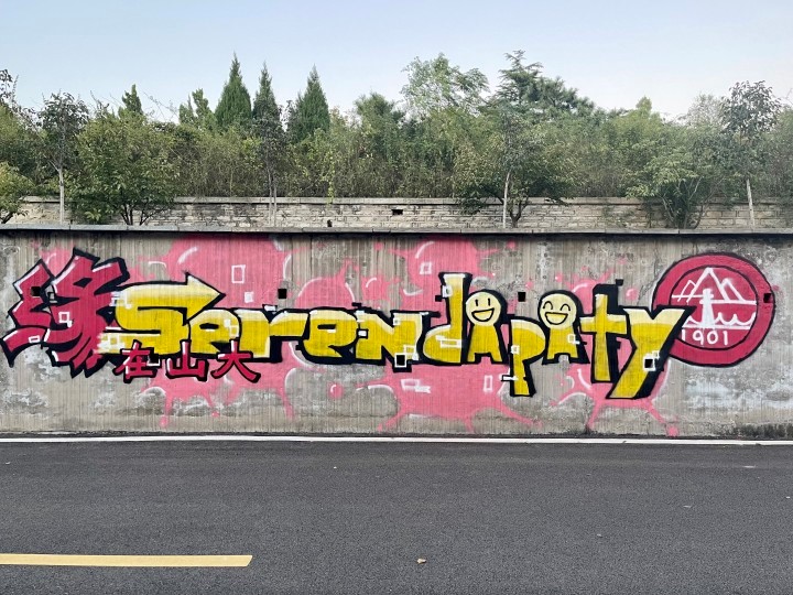 活动由微电子学院学生会征集涂鸦设计,最终选定本科生王厅、刘飞扬、杨佳钰、黄彦钧的涂鸦设计。该设计以“缘在山大serendipity”(serendipity译为美好的邂逅)为主体,右侧附有山东大学校徽,背景为粉色泼墨的图案,整体以黄、粉为主色调,寓意2022级新生与山大有着美好的邂逅,欢迎新生加入学校温暖的大家庭。