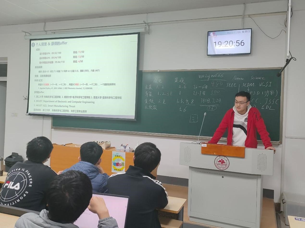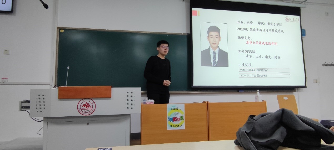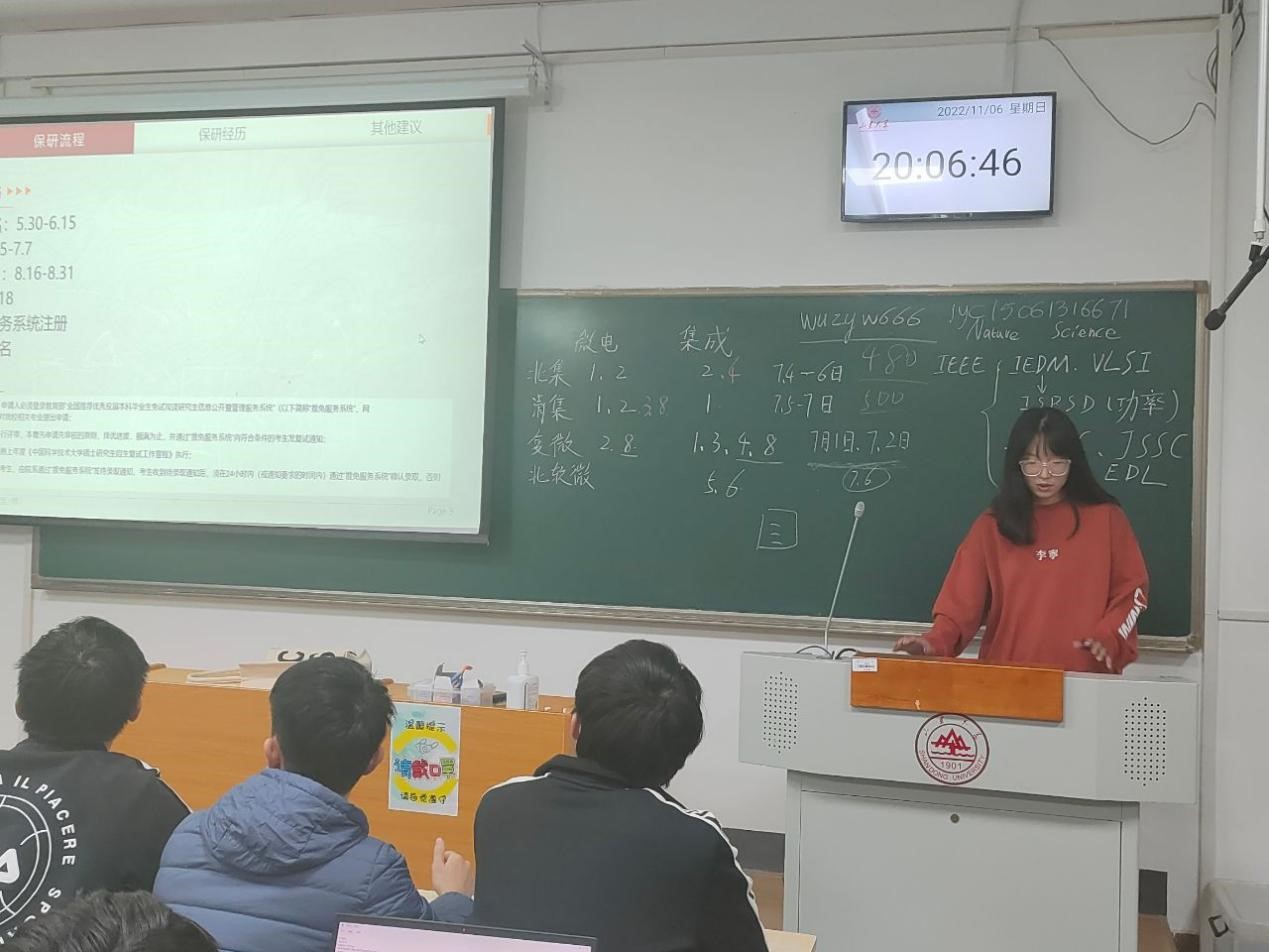 保研至清华大学集成电路学院的刘晗分享了他的保研经历,他对2019级学子取得的优秀成绩表示称赞,他建议大家,要想保研上好的学校首必须保证自己的绩点和六级成绩,其次参加一些对保研有加分的竞赛、科研为自己的成绩锦上添花。同时他具体讲了准备夏令营的具体流程并为场下学弟解答了相关的问题。