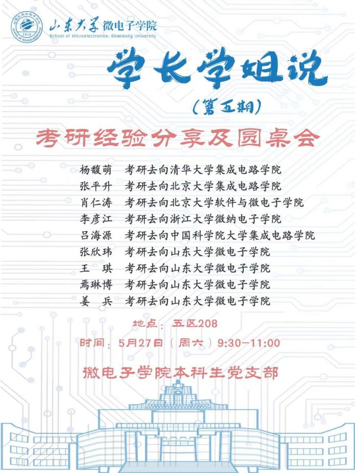 为帮助学生熟悉考研流程,明确学业规划,提高专业学习能力,近日,微电子学院举办了“学长学姐说”系列活动(第五期)——考研经验分享与圆桌会。本次活动邀请了微电子学院2019级本科生杨馥萌、张平升、肖仁涛、李彦江、吕海源、张欣玮、王琪、焉琳博、姜兵等担任主讲,活动由杜怡凝主持。